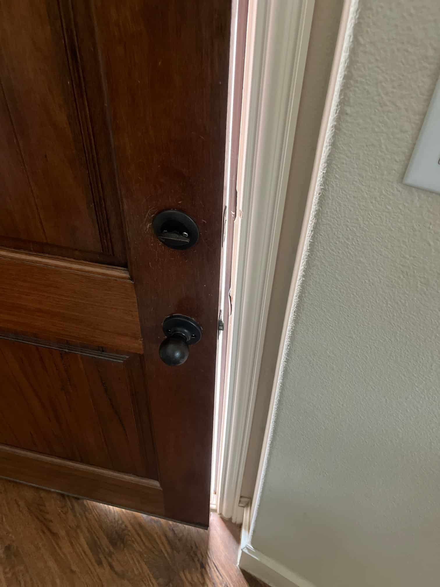 Replaced the alarm battery with the customer-provided part and tested that the system powered back up. Checked the front door and secured loose screws so it closes properly.