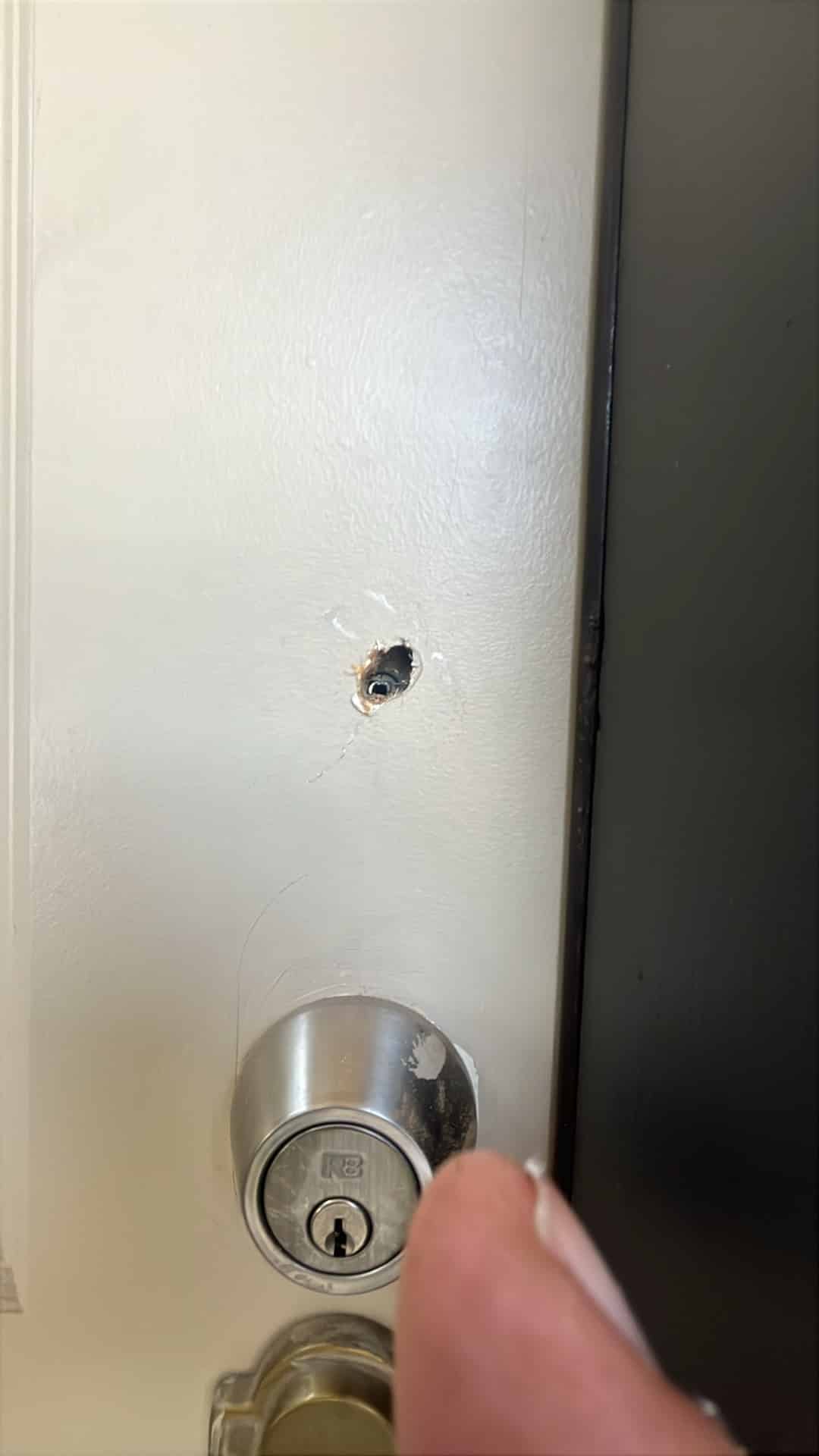 Filled a small hole on the exterior side of the door and sanded it smooth before applying matching paint. The repair blended cleanly with the rest of the surface for a consistent finish.