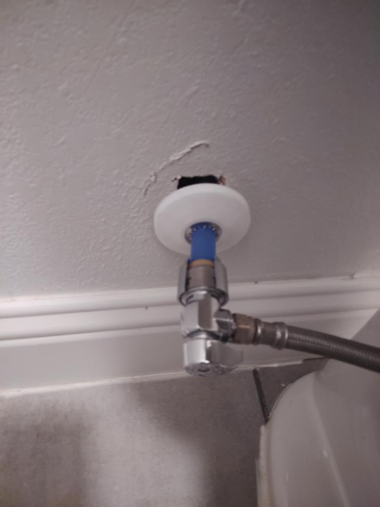 Removed the old toilet supply shutoff and installed a new valve, then corrected a small leak on a return visit. Pressurized the line and checked for drips to make sure everything stayed dry.